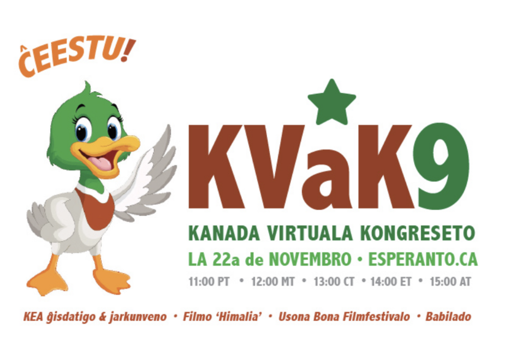 Du fojojn jare, KEA organizas virtualan kongreson por Kanadanoj kaj ĉiuj ajn aliaj kiu ŝatus partopreni. Ĉi-foje ni reliefigos kinoarton en Esperanto. Ĝi komenciĝas iomete antaŭ 14:00 oriente en Otavo (11:00 pacifike / 12:00 montare / 13:00 centre / 15:00 atlantike / 18:00 UTC).Skiza enhavo: